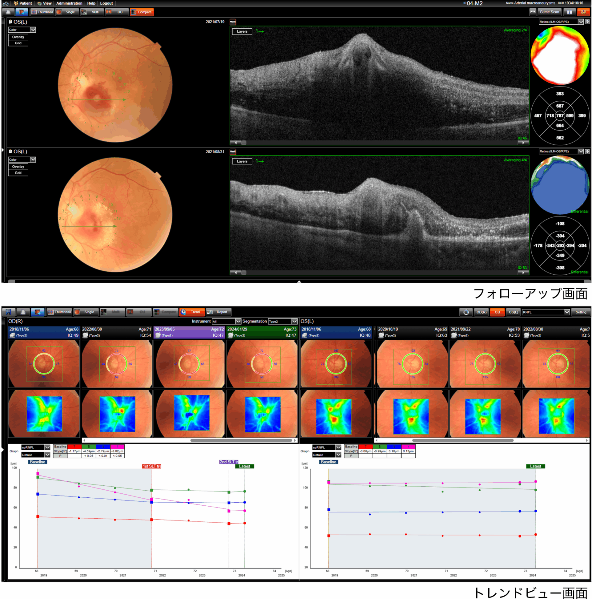 前回撮影したOCT像と同じ位置を撮影することができます。経過観察において、日付の異なる撮影画像を並べて表示でき、過去と現在の同じ位置のOCT 像を比較・観察することができます。