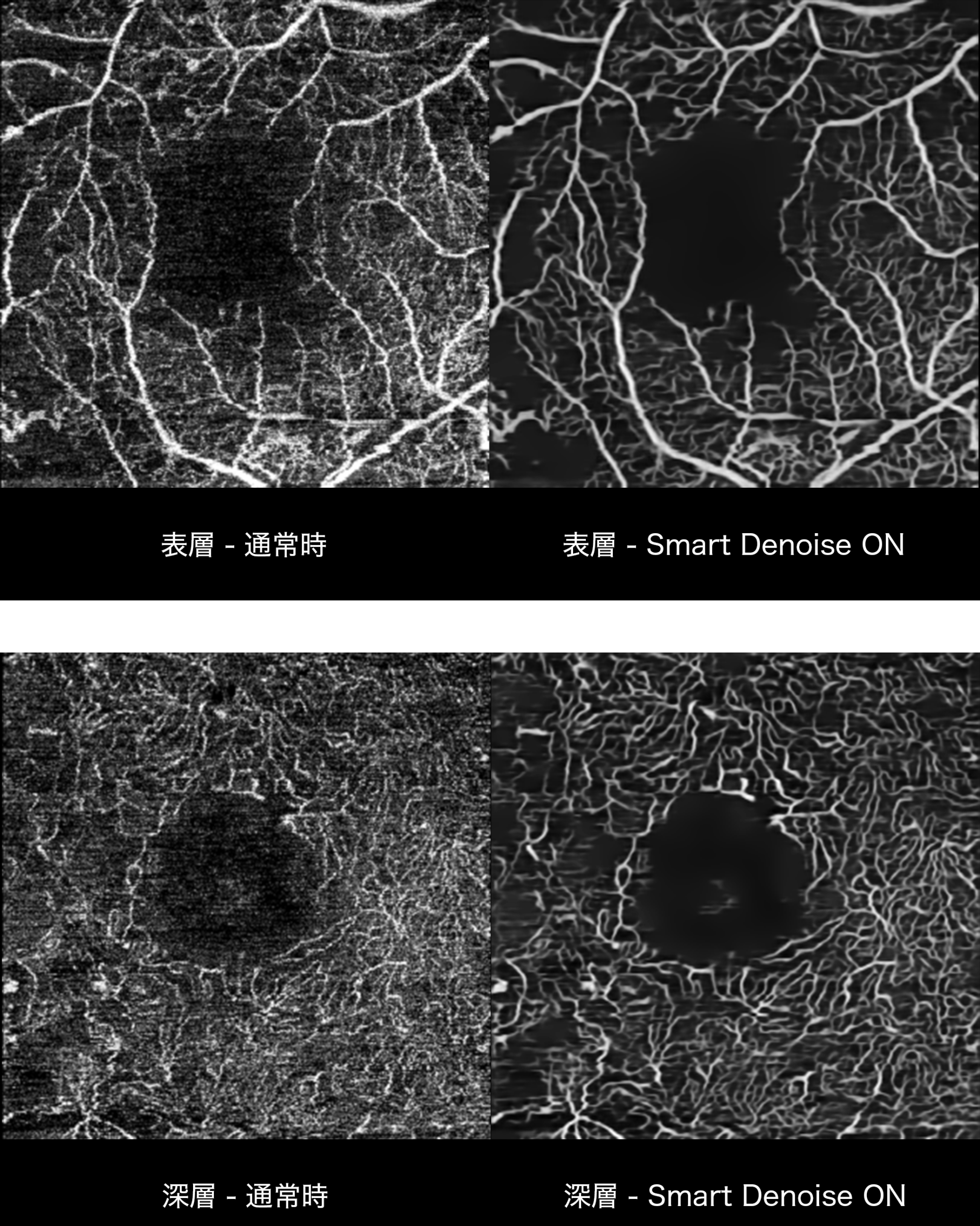Maestro2はOCT-Angiography撮影機能を搭載しています。スキャン範囲は3.0×3.0mm、4.5×4.5mm、6.0×6.0mmから選択可能で、黄斑部と視神経乳頭部を中心として撮影した解析結果をPC画面やレポートとして表示することができます。Smart Denoise(AIによるノイズ除去機能)が利用可能になり、トプコン独自のノイズ除去技術によりアーチファクトが少なくコントラストの高いOCT-A画像が描写できます。