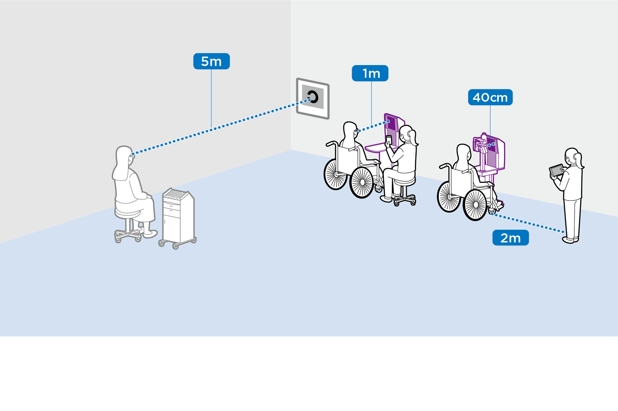 5mの距離を必要とせず、検査室のレイアウトに合わせた設置距離が選択可能です。設置場所を選ばないコンパクトな視力表で、検査エリアの省スペース化が図れます。別売品の検眼用テーブルを利用することで車いすのままでも検査が可能です。