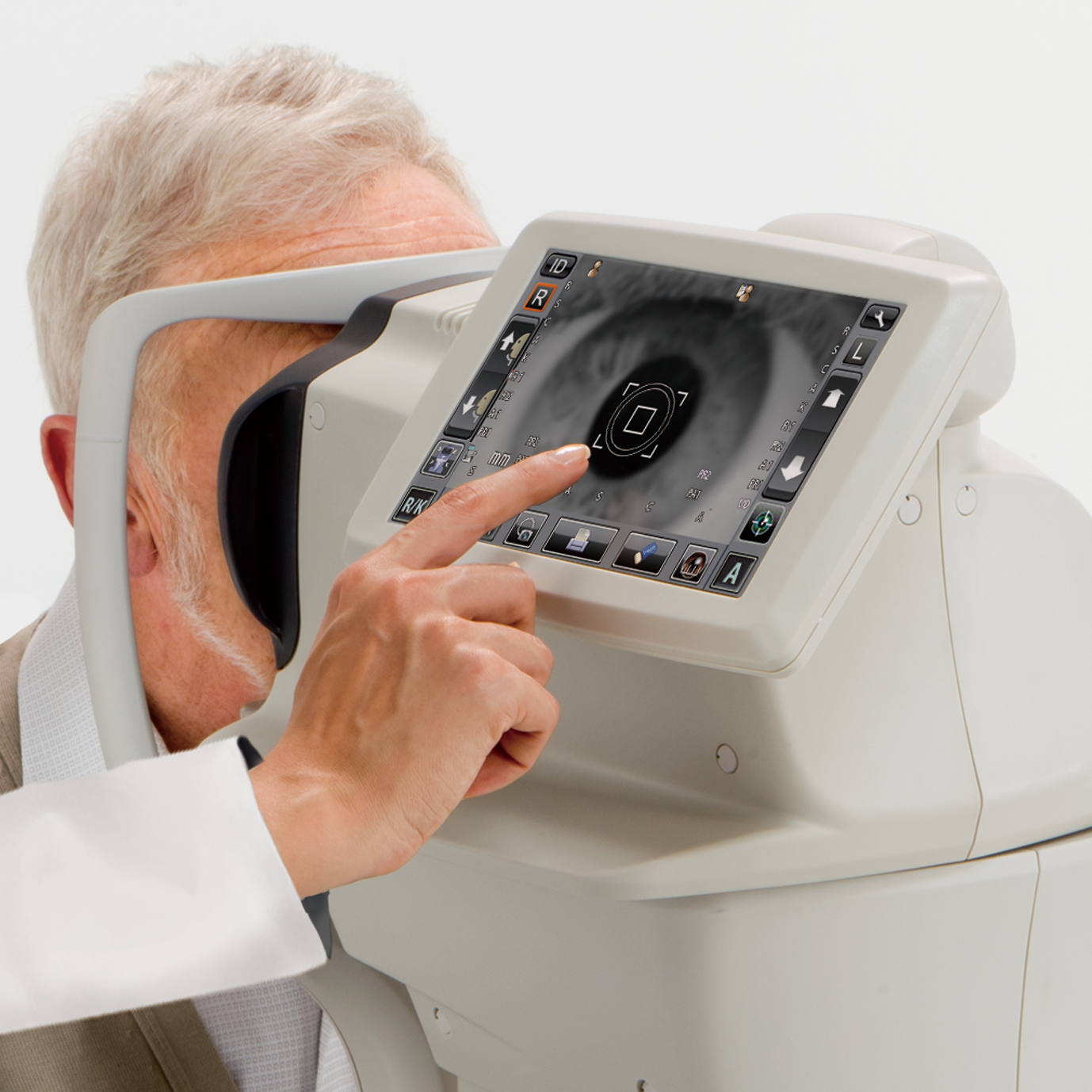 コンパクトデザインに加え、コントロールレバーレスで全ての操作をタッチパネルで行います。タッチパネル上の瞳孔中心付近をタッチするだけで、左右眼のデータを自動で取得できます。