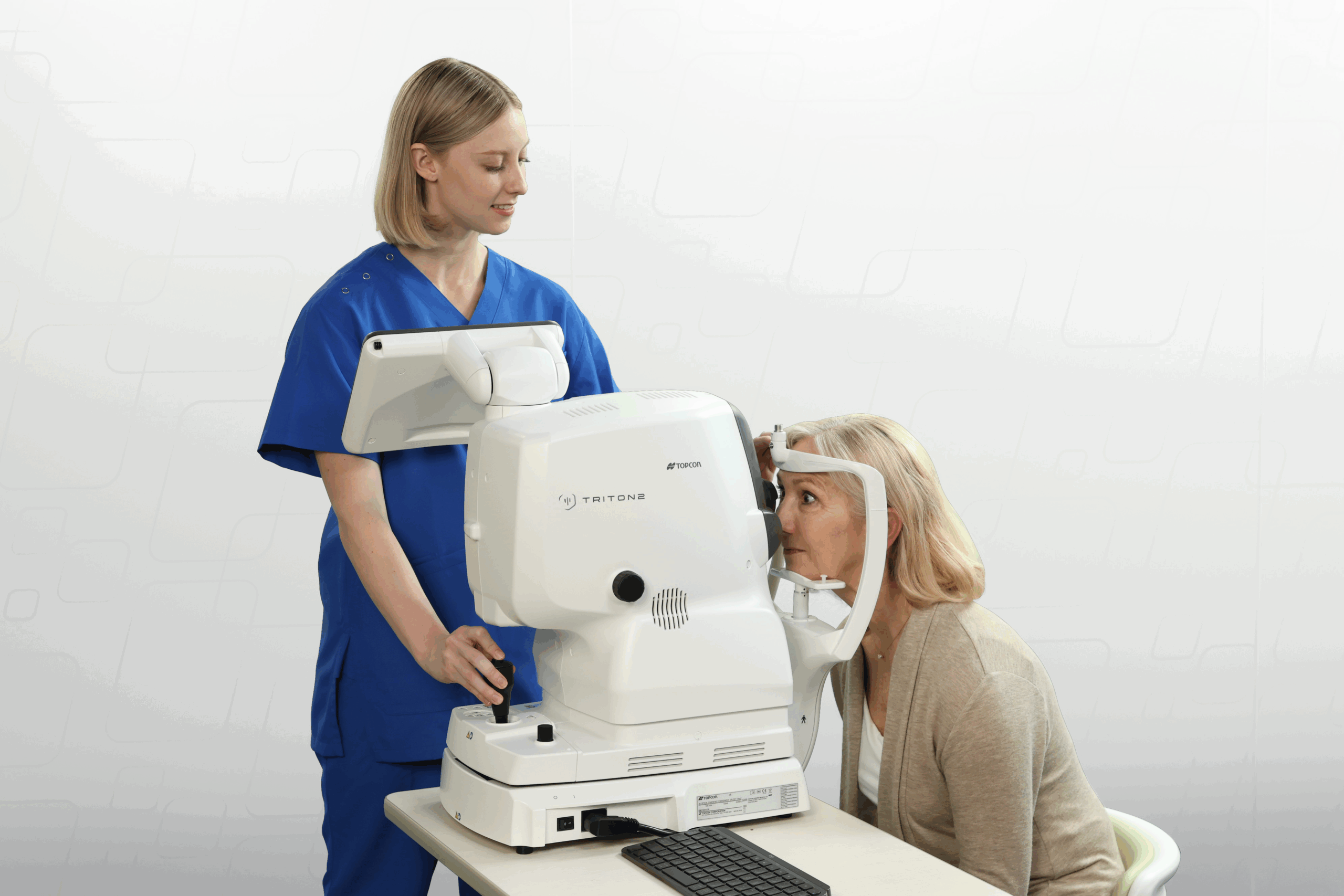 明るい検査室でも、簡単な操作で様々な被検者に対し、OCTと眼底画像を一度に撮影できるTriton2 & IMAGEnet®7は、