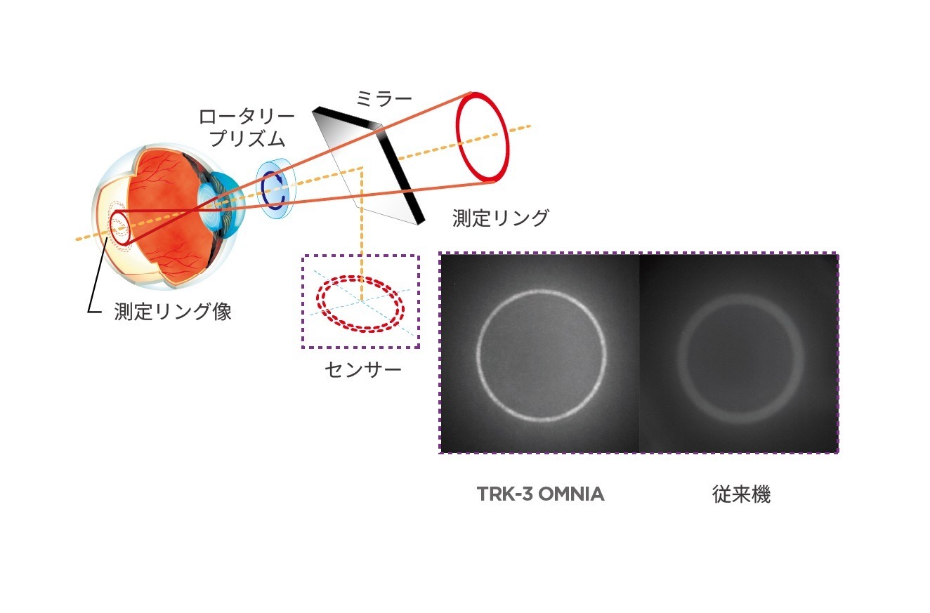 トプコン独自のロータリープリズム測定方式を採用。投影するリングを偏心回転させることでムラの少ない測定リングが得られ、最小瞳孔径Φ2.0mm(レフ測定時)の眼でも測定が可能です。TRK-3 OMNIAはレフラクトメータにの測定光源をリニューアルし、従来機より安定した測定ができるようになりました。中間透光体に混濁がある場合でもクリアな反射光を得られるようになり、測定成功率が向上しました。