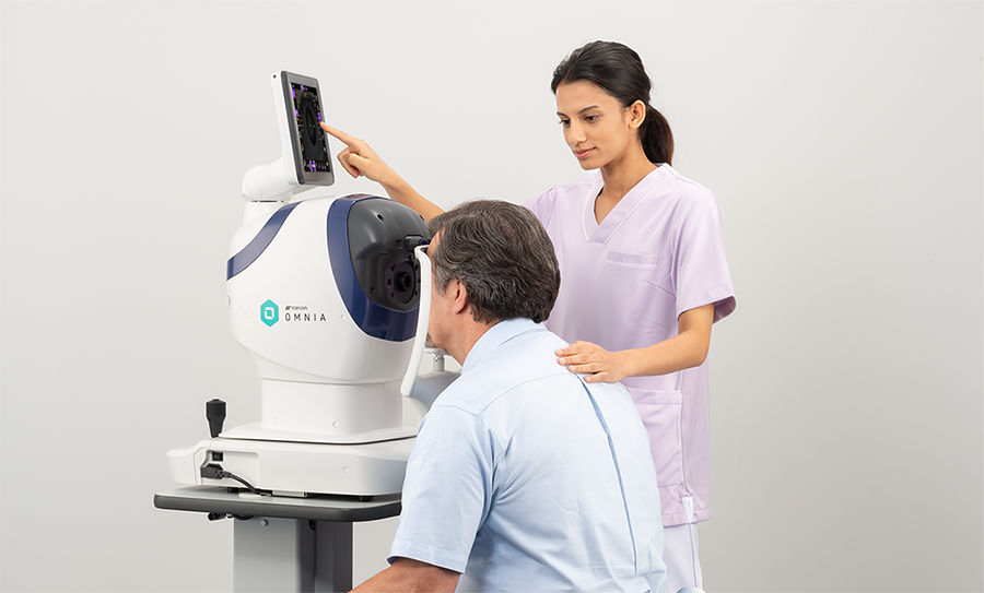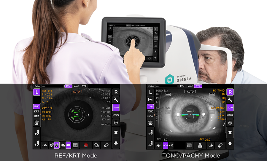 TRK-3 OMNIAは、レフラクトメータ、ケラトメータ、トノメータ、パキメータが一台に集約されています。レフ測定と眼圧測定がワンタッチで完了できるため、患者さんも移動する手間がなく、検査スタッフにも患者さんにもやさしい多機能検査機器です。